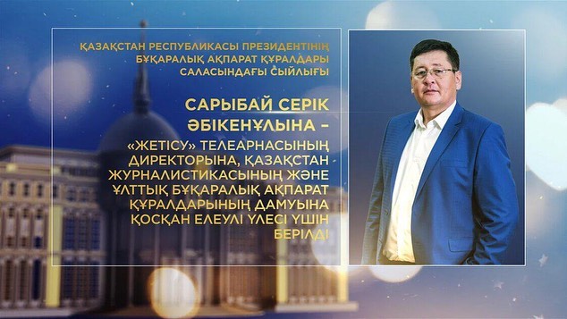 Сарыбай Серік Әбікенұлына – "Жетісу" телеарнасының директорына, Қазақстан журналистикасының және ұлттық бұқаралық ақпарат құралдарының дамуына қосқан елеулі үлесі үшін;