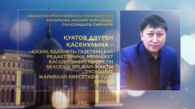 Қуатов Дәурен Қасенұлына – "Қазақ әдебиеті" газетінің бас редакторына, Мемлекет басшысының қызметін белсенді әрі жан-жақты түсіндіріп, жариялап-көрсеткені үшін;