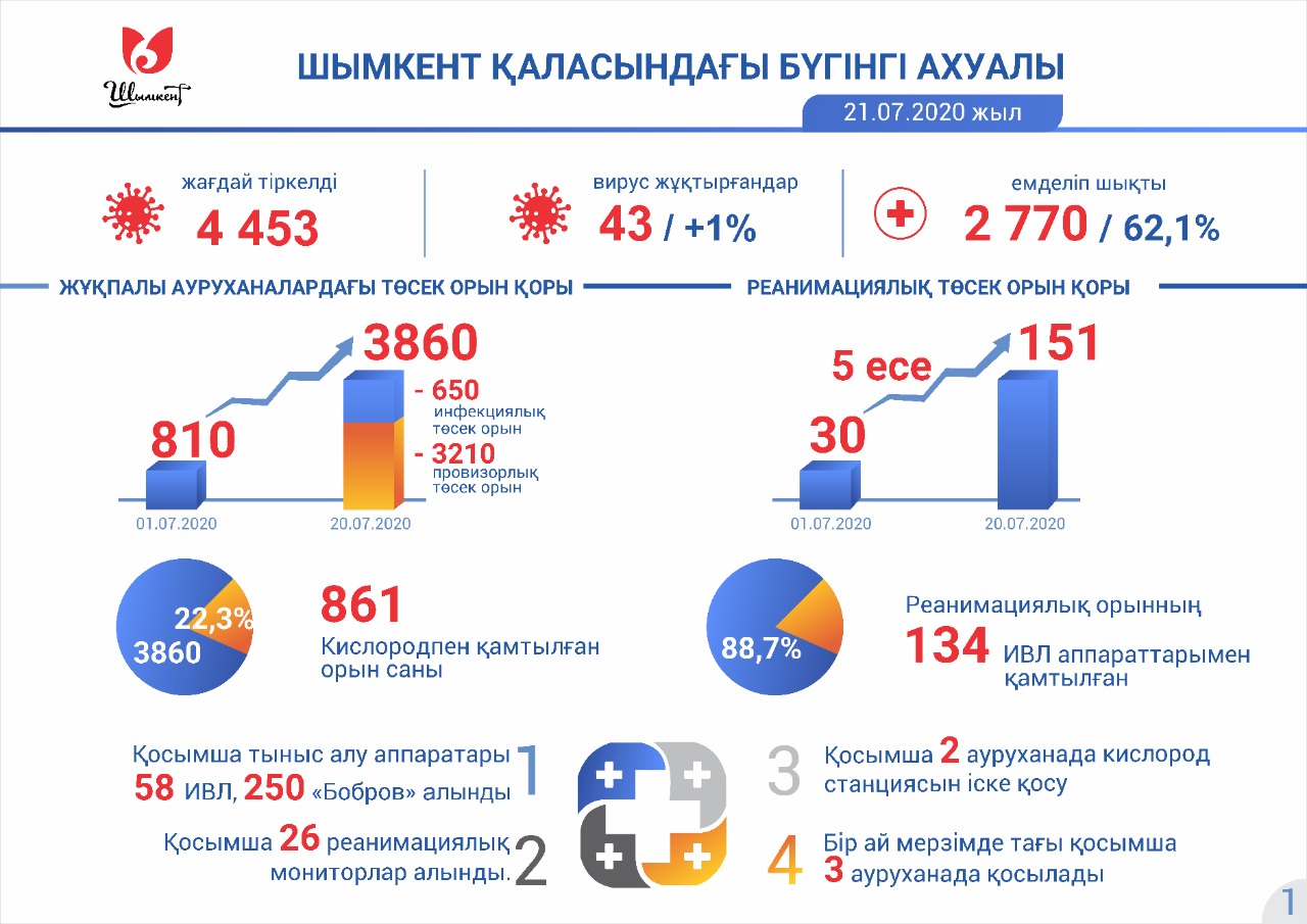 Кислородпен қамтылған орын саны 861-ге немесе жалпы орынның 22,3 пайызына жеткізілді. Кислородпен тұрақты түрде қамтамасыз ету мәселесі де шешілуде. Қосымша 2 ауруханада кислород станциясын іске қосу жұмыстары жүргізілуде. Бір ай мерзімде тағы 3 ауруханада қосылатын болады.