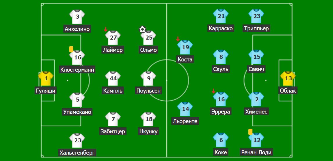 «Атлетико»: қақпашы – Облак; қорғаушылар – Триппьер, Савич, Хименес, Ренан Лоди; жартылай қорғаушылар – Карраско, Сауль, Эррера (Жоау Феликс), Коке (к) (Фелипе); шабуылшылар – Коста (Мората), Льоренте.