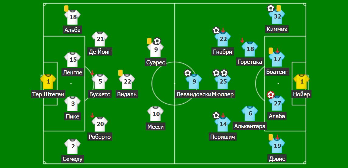 Алаба 7 (өз қақпасына), Суарес 57 – Мюллер 4, 31, Перишич 21, Гнабри 27, Киммих 63, Левандовский 82, Коутиньо 85, 89.