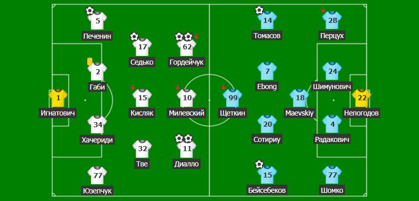 Гордейчук 16, Печенин 17, Гордейчук 22, Седько 37, Диалло 55, 90 – Томасов 45, Ротариу 53, Бейсебеков 87.