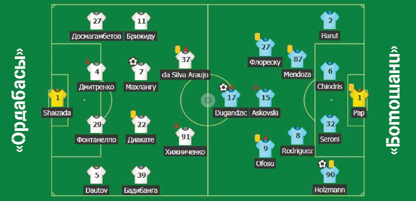 Ал «Ордабасы» болса, өз алаңында Румынияның «Ботошани» командасына 1:2 есебімен жол беріп, Еуропа лигасы турнирін ерте аяқтады. 12 минутта «Ордабасы» алға шығуға мүмкіндік алды, бірақ сенегалдық жартылай қорғаушы Абдуллай Диакатенің 11 пенальтиден мүлт кетті. «Сен гол соқпасаң, саған соғады» деген футболдың танымал мақалы осы жерде тағы бір рет еске түсті. Себебі, ойынның 25 минутында «Ботошанидің» австриялық қорғаушысы Марсель Хольцманн гол соғып, командасын алға шығарды. «Орда» 31 минутта есепті теңестірді. Команда ойыншылары оңтүстік африкалық жартылай қорғаушы Мэй Махлангудың арқасында бір желпініп қалып еді, араға екі минут салып хорватиялық шабуылшы Марко Дуганджич есепті 2:1 жеткізіп, румыниялықтарды келесі кезеңге шығарды.
