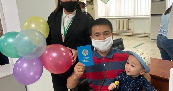 Алматы қаласының Медеу ауданының тұрғыны Зейнаб пен Арслан Газиевтер қызы Лейланың шетелге шығуға рұқсат беретін паспортын алып кетуге келіп, құттықтауларға ие болғанына риза.
