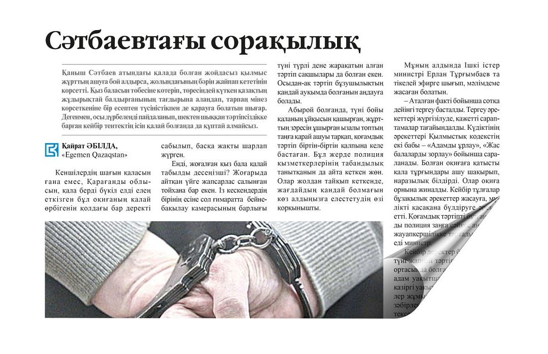 Қарағанды облысының аумағында болған қылмыстық оқиғаларға қатысты екі жаңалық өткен аптада елді кәдімгідей елең еткізді. Оның бірі – Сәтбаев қаласында бес жастағы қыз баланы зорлаған деген күдікке ілінген еркексымақ кеншілер астанасындағы тергеу изоляторында асылып өлген екен. Бұл турасында облыстық қылмыстық-атқару жүйесі департаменті ресми түрде хабарлады.