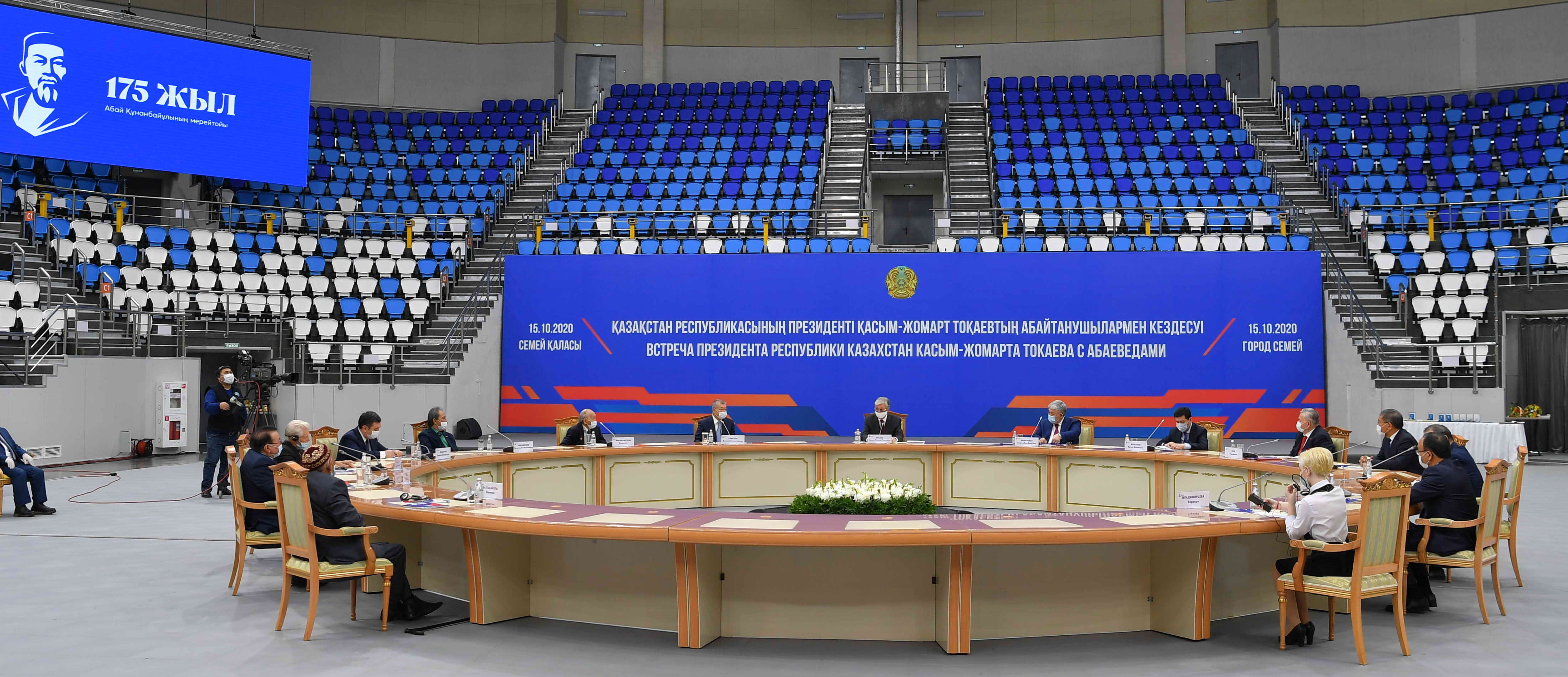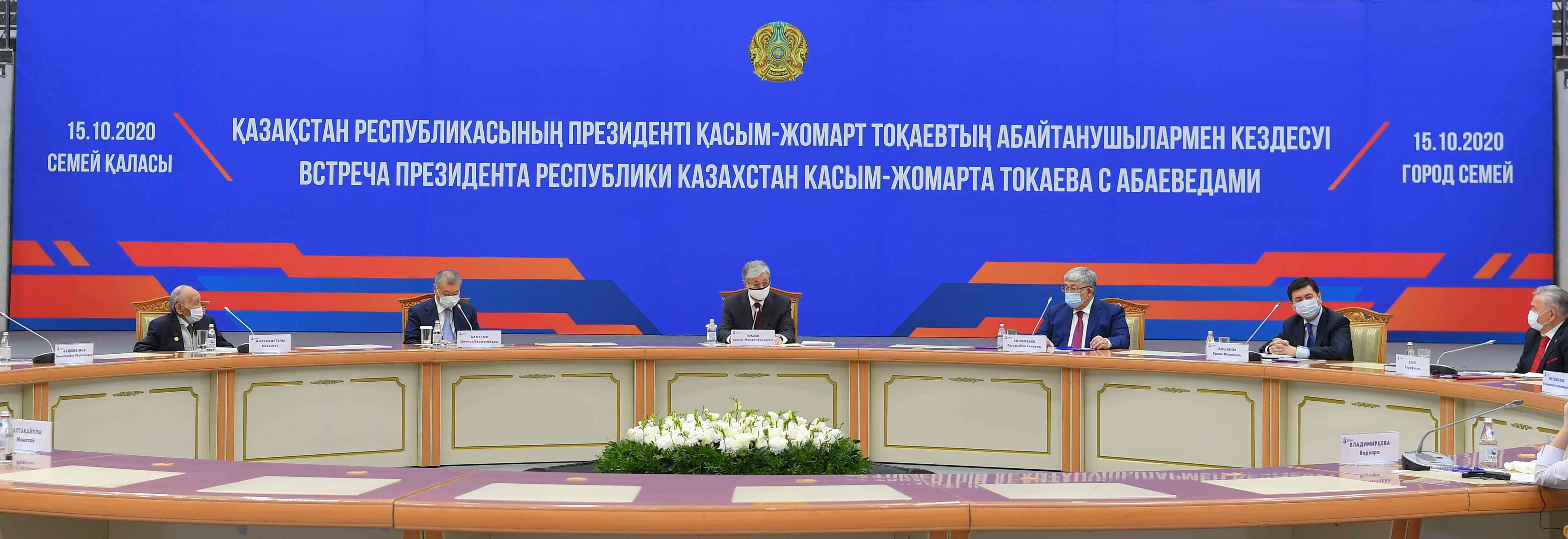 Президент ұлт зиялыларымен қасиетті топырақта, тарихи маңызы зор Семейдің төрінде жүздесіп отырғанына қуанышты екенін жеткізіп, Абайдың 175 жылдық мерейтойы әлемдік пандемияға тап келсе де, ұлы баба рухы алдындағы перзенттік парызымызды адал атқаруға күш салғанымызды атап өтті. Сонымен қатар бұл мерейтойдан той тойлауды емес, тағылым алуды мақсат еткенімізді айтты.