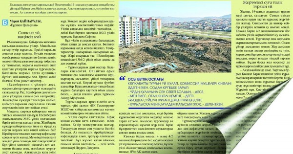 Естеріңізге сала кетейік, «Шағын ауданның мәселесі шаш етектен» атты мақалада 19-шағын ауданда салынып жатқан бірнеше тұрғын үйдің сапасыздығы жөнінде мәселе көтерілді. Атап айтсақ І.Есенберлин 2/2, Көкжал Барақ 4, Əл-Фараби 38/2, Қазыбек би 46, Уəлиев 9/3 мекенжайларындағы көпқабатты үйлердің тұрғындары жаңа баспаналарының сапасыздығына шағымданып, бармаған жерлері, ашпаған есіктері қалмағанын айтқан болатын.
