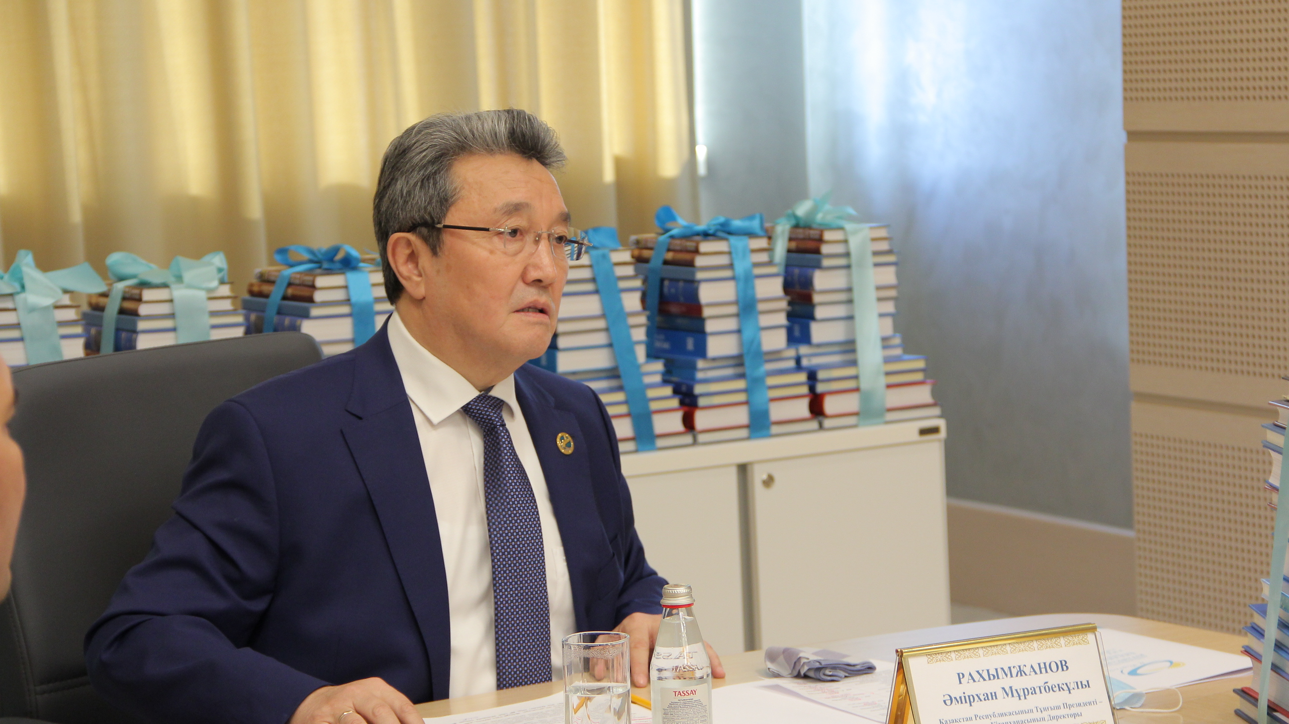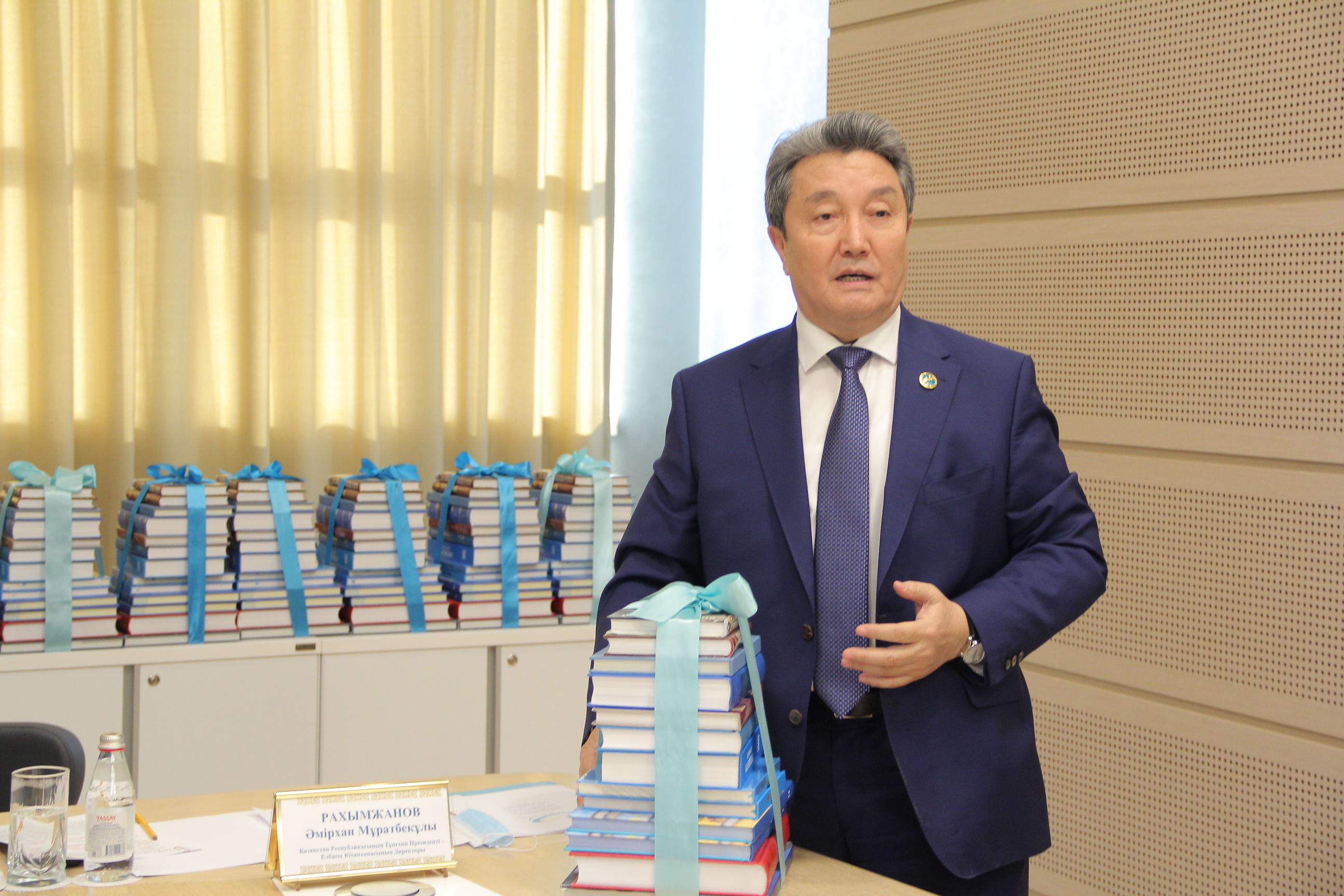 – Елбасы кітапханасы білім беру мен мәдени бағыттағы міндеттерді жүзеге асырудың жаңа мүмкіндіктеріне қол жеткізіп отыр. Мекеменің музей, архив, кітапхана қорын ұштастырған жаңа ғимарат қазіргі жастарға рухани, патриоттық тәрбие беруде, құндылықтар жүйесін қалыптастыруда маңызды ісін жалғастырады. Елбасы өзі айтқандай: "Еліңді сүйе білсең, жан аямай қызмет ете білсең, елің де сені алақанға салып аялай біледі". Сол Отан сүйгіштікті тәрбиелеу үшін біз барынша мүмкіндіктерімізді пайдаланып келеміз, – деп Ә.Рахымжанов қонақтарды қарсы алып, пандемия кезеңінде мекеме онлайн-форматта белсенді жұмыс істеп жатқанын атап өтті.
