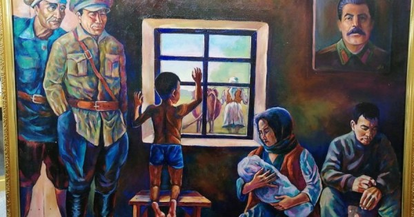 Жас суретші жазушының әңгімесіндегі «Арқалап кеткен жоқ, жетектеп кетті ғой, аға. Мұндағы бәріміздің қарап отырғанымыз – бір қызыл сиырдың төрт емшегі еді, соны алып кетті ғой апамыз...» деген жолдарын терезенің арғы жағында көрсетіп, философиялық ойды жеткізген. Бергі планға жұпыны үйдің терезесінен телміріп қарап тұрған қара ұлды бейнелеген. Отағасы терең уайымға батқандай. Әйелі құндақтағы баласына мейірімін төгіп отыр. Қабырғада Сталиннің портреті ілінген. Қызыл жағалылар есікті шалқасынан ашып, төбелерінен төніп тұр. Міне, бас жүлде иегері Мәди Қайырхан әңгімедегі негізгі ойды топтастырып, бір картинаға сыйғызған.