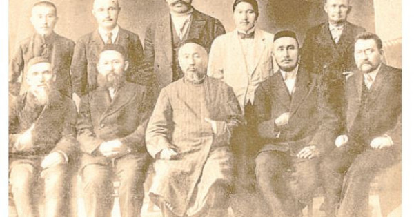 oртада орындықта отырған: тақиялы – Міржақып Дулатұлы, сол жақ жанындағы – Ахмет Байтұрсынов, одан бергі – Райымжан Мәрсеков. Оң жақта жерде жеке отырған – әнші Әсет Найманбаев. Шәуешек қаласы, 1918 жыл.