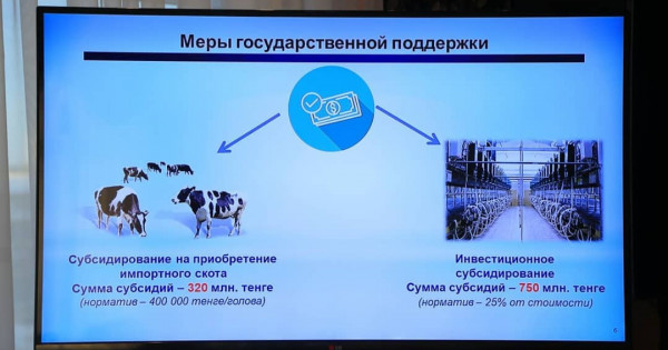 «Облыс мал шаруашылығындағы барлық бағыттарды дамыту үшін айтарлықтай ресурстарға, өнімді өткізу бойынша жоғары әлеуетті мүмкіндіктерге ие. Бұған қол жеткізу жолдарының бірі - сүт өңдеу кешендерін құру арқылы мал шаруашылығын өнеркәсіптік негізге көшіру» - деді облыс әкімі Архимед Мұхамбетов.