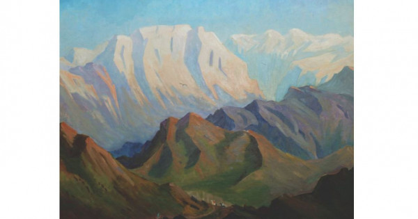 Оқырман бұл сұлулықты бірінші пландағы қошқыл түстермен боялған тауда тұрып бақылайды. Содан кейін біз жасыл түспен көмкерілген тау бөктерінің тізбегін көреміз. Ал самал жел соғып тұрған шыңдары тастақты жыныстарымен түксиіп тұр. Картина бойымен сәл жоғары көтерілсеңіз, солардың арғы жағынан көз жауын алатын аппақ қарлы тау шыңы шыға келеді. Қарлы шыңдар бірінші және екінші пландағы тауларға мүлде керағар орналасқан. Олар көгілдір аспан астында ауада салмақсыз қалықтап тұрғандай. Бұлар – қатып қалған тап-таза мөлдір мұз қабаттарының сақтаушысы.