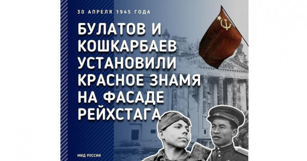 Рейхстагты алу кезінде көрсеткен ерлігі мен батырлығы үшін Рақымжан Қошқарбаев пен Григорий Булатов Қызыл Ту орденімен марапатталды. Қошқарбаевқа ескерткіштер оның Отаны – Қазақстанның Ақмола облысында және республиканың астанасы Нұр-Сұлтан қаласында, ал Булатовқа Киров қаласында орнатылды». Ресей Сыртқы істер министрлігі жариялаған жазбаның толық мәтіні осындай.