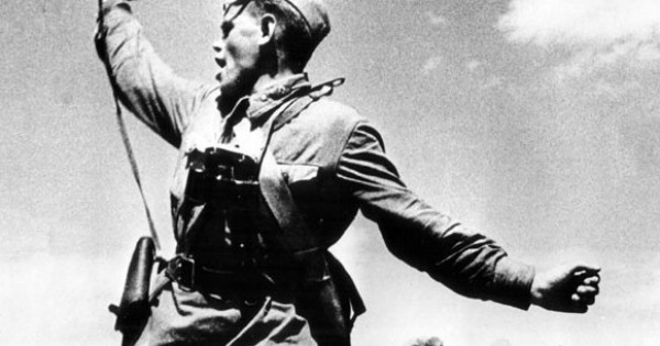 Макс Альперт Қызыл Армия жауынгерін өзінің Leica камерасымен 1942 жылы 12 шілдеде Оңтүстік майданда, Ворошиловград шайқасы кезінде суретке түсірген. «Офицер окоптан көтеріліп, сарбаздарды шайқасқа шақырды», деп еске алады өз естелігінде.