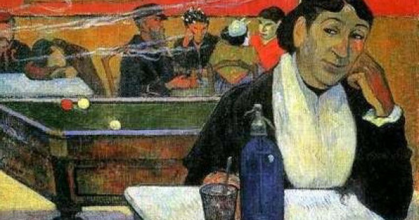 Кенептің алдыңғы жағында жабырқау әйелдің бейнесін көреміз. Бұл мекеме иесінің келіншегі – Джин ханым. Ол шынтағын үстелге тіреп, қалың ойдың тұманында адасып жүргендей. Артындағы шудан қашып кете алмайды. Үстел үстінде аяқталмаған ішімдік пен бөтелке бар. Осы тұста бір аңғарғанымыз Пол Гоген картинаны әртүрлі композициялық бөліктерге бөлетін ашық түсті жолақтарды сызған. Оқырманға ең жақын бөлік ақ түспен боялған. Картинаның ортасы жасыл түспен сырланған. Бұл жерде бильярд үстелі мен оның астында отырған мысықтан басқа ешкім жоқ. Кенептің жоғарғы жазықтығы қызыл түспен берілген. Онда кафеге келушілердің сұлбасы анық көрінеді. Олардың барлығы бір көңіл күйдің әуеніне төңкеріліп, өмірге мұң шағуда. Тағы бір нәзік деталь – мұндағы кейіпкерлердің көбі суретшінің таныстары.