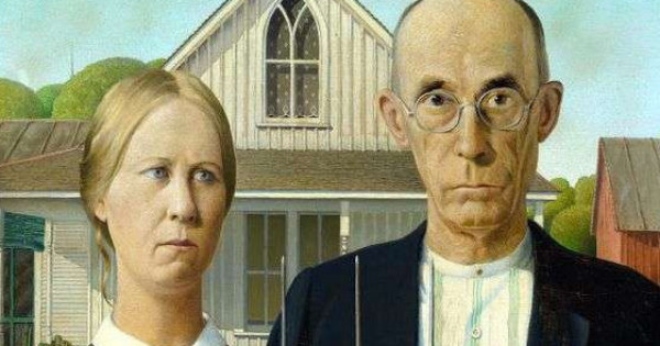 Картинаның аты – «Америкалық готика». Композицияның кейіпкерлері – ағаштан соғылған қарапайым үйдің алдында тұрған фермер мен оның қызы. Бақсаңыз, артқы фондағы ғимарат готикалық стильде жазылған. Диқанның айырын қолына мықтап түйгенін көреміз. Бұл жұмыс құралы емес, қарудың ерекше түрі секілді. Бір ашудың лебі еседі.