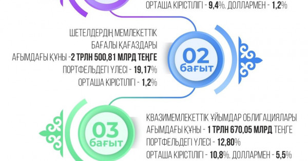 Екінші бағыт – шетелдердің мемлекеттік бағалы қағаздары. Мұның көлемі – 2 трлн 500,81 млрд теңге. Оның портфельдегі үлесі – 19,17 пайыз. БЖЗҚ-ның зейнетақы активтері портфеліндегі шетелдердің мемлекеттік бағалы қағаздарының орташа кірістілігі жылына 1,2 пайызға тең.