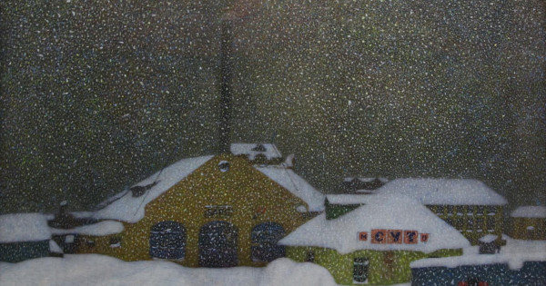 Иван Фомич салқын, тынық түстерді қолдана отырып, тып-тыныш әрі жайлы кішкентай ауылдың бірқалыпты тіршілігін жеткізген. Еңбек адамдары қақаған аязды да жеңіп шығуға қауқарлы екенін баяндайды. Тұрмыс тауқыметін тартқан пенде иесі азапты суықты да, қанды соғысты да, қараорман қайғыны да еңсерер күшке ие. Мольберттегі бояумен жазылған мақаланың мәні осы.