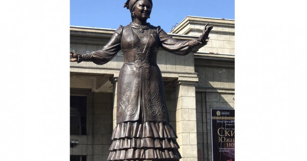 Қазақ өнеріне қайталанбас із қалдырған тарихи тұлғаның ескерткіші композициялық шешімінің шымырлығымен көз тартады. Қола және граниттен жасалған ескерткіштің биіктігі – 4,8 метр. Авторлары – Д.Ағзамов, У.Ақжолтай, А.Жамхан, А.Қабыл. Үлкен шығармашылық өрлеудің ізі байқалатын талантты мүсіншілердің туындысында күлімдеген жүзіне бүрмелі көйлегі мен оюлы бешпенті, үлпілдеген үкілі тақиясы жарасқан күміс көмей әнші дәл осы сәт сахнада «Ах, Самара городок» әнін сызылта салып тұрғандай әсер қалдырады. Тастұғырдың үстінен тұтас бір дәуірдің ұлттық бейнесі төніп тұрғандай. Сахнаны серік еткен саналы ғұмырында қазақтың ұлттық киімі мен сән-салтанатын насихаттап өткен ұлтжанды әншінің образынан күллі халқымыздың болмысы мен өмір салтының аңғарылып тұруы – биік шеберліктің жемісі. Әсем Алматының әрін кіргізген әнші мүсіні жиырмадан астам жобаның ішінен үздік деп танылып, ашық байқау нәтижесінде таңдалып алынған.