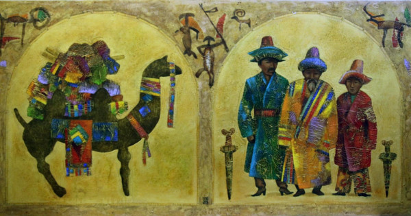 Бақсаңыз, туындының жоғарғы жағына петроглифтердің суретін және сақ жауынгерлерінің қаруы саналатын екі ақинақтың суретін орналастыру арқылы көшпенділердің байырғы мәдениетін жырлайды. Мұнда суреткер костюмдерге, баскиімге, тұрмыстық дәстүрлі заттарға ілтипатпен қарайды. Сол арқылы қазақ мәдениетінің тарихын ғана емес, сонымен қатар скиф, сақ тайпаларының дәуірін де жырлайды.