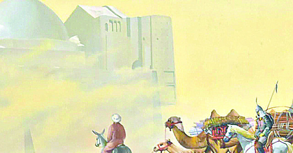 Суретші ежелгі қалаға жақындап келе жатқан түйе керуенінің қалай тұрмыстық заттар мен шағын шатырларды артып алғанын бейнелеген. Құмды боранның тозаңды бұлтының арасынан оның нобайы ғана байқалады. Керуеннің басындағы есекке мінген керуенбасы қимыл ырғағын көрсетіп келеді. Ол жолдың дұрыстығына, демалатын және түнейтін орын мен уақытты таңдауға, сол сияқты малдардың жем-шөбін беріп, суғару тәртібіне жауап береді. Керуенді қарулы жауынгерлер қорғап келеді, араларында бүркіт ұстаған аңшылар да бар. Ақылды төбеттер болса керуенге ілесіп келе жатқан қой мен ешкілерді айдап келеді.
