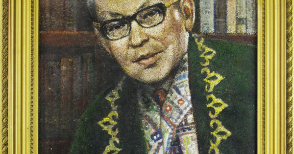 Жазушының бейнесін айнытпай жасаған. Әйнектің астында сақталған. Жақтауы – ағаш. 1982 жылы жазушының 80 жылдығына қызылордалық іні-досы Оразғали Ерекешев тарту еткен. «Әкемдей болып кетіп еді» деген естелігінде («Ғабит Мүсірепов туралы естеліктер», 2004) ол Ғабеңмен алғашқы таныстығы (1958 ж.), қаламгердің Арал өңіріне сапары, осы сапарынан кейін теңіздің болашағына қатысты «Правда» газетіне мақала жазғанын атап өтеді. Ал кейінірек «Алпыс төрт мың шаршы километр жерді алып жатқан теңіз түптердің түбінде құрғап қалар болса, одан борайтын тұзды шаң қанша дүниені бүлдіретінін кім білсін!» («Қазақ әдебиеті»,11.09.1981), – деп алаңдаушылық танытқанын жазады. Көп адамға сыр аша бермейтін Ғабең өзінен 25 жас кіші Оразғалиды Алматыға үйіне қонаққа шақырып, қазақтың зиялы қауымымен таныстырып, жақын араласып кетеді. Оразғали Аралдың жағасына киіз үй тіктіріп, Ғабеңді бірнеше рет қонақ қылады. Ел адамдарымен таныстырып, әңгіме-дүкен құруына жағдай жасайды. Алматыға шұбат жеткізіп тұрады. Оған 1971 жылы Ғабең өзі мініп жүрген «Газ-69» машинасын сыйға тартады. Жыл сайын Алматыға шақырып, «аунап-қунап демалып қайт» деп, келген сайын қаржылай көмек беріп: «...жақсылап демал, тұрған жерің апат, қайбір денсаулықтарың мықты еді сендердің», – деп қамқорлық танытып отырған. О.Ерекешов сөз зергеріне деген өзінің ерекше құрметінің бір белгісі ретінде 80 жылдығына арнайы тапсырыспен күріштен портретін салғызып, сыйлайды. Бұл күнде портрет Музей кешенінің қорында сақтаулы.