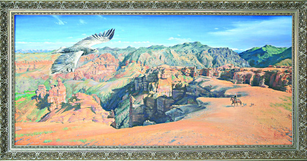 Бақсаңыз, картинаны реалистік тұрғыда жазуға талпынған автор еркіндік пен асқақтықтың символын сызып отыр. Шығарма иесі – белгілі суретші Бауыржан Бәйділда. Қылқалам шебері елдің кең-байтақ жерін көлденең өлшемде сызықтық перспектива арқылы шебер көрсеткен. Картинаның артқы қапталындағы биік таулар алдыңғы пландағы бүркітке параллель көрініс беріп тұр. Ортаңғы планда қалып қойған жігіт бейнесі де туған жеріне деген құрметін сездіріп тұр.