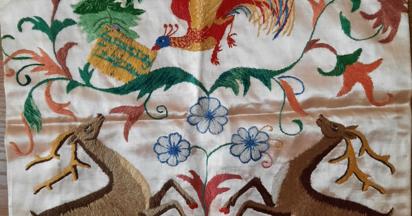 Ал төменгі жағына тұмсығына құттықтау хатты іліп алып, ұшып бара жатқан тауыс құсын, сонымен қатар орманның әдемі жануары – қос бұғы, гүлдер бейнеленген. Жастықшаның астыңғы жағы біркелкі жасыл түсті мата.
