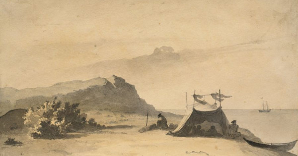 Осылай деген Арман менің де, өзінің де ұялы телефонын және көліктегі компьютерін қолына алып, олардан: «Т.Шевченко. 1848-1849 ж.ж. Арал теңізі», – деген сөздерді теруге кірісті. Арада біраз уақыт өткен соң ноутбук экранынан қарындашпен салынған түрлі эскиздердің сұлбасы көріне бастағаны!.. Одан кейін «Т.Шевченко. «Қосаралдағы маяк», «Арал теңізіндегі жарқабақ» деген картиналар жарқ ете түсті де іле-шала ол ақынның «Райым бекінісі», «Қазақтардың киіз үйлі тұрағы» атты фрагменттерге ауысты. Содан соң барып, «Т.Шевченко. Барсакелмес аралы жағалауындағы экспедиция шатыры» деген сарғыш түсті қағаз фонындағы туындының шыға келгені! Байыптап қараған адамға шығарма өте әсерлі. Өткен заманнан хабар беретін онда біз қазір мына өзіміз үстінде тұрған үлкен жота мен оның сол кездегі теңіз суына тиіп тұрған Жаманмұрын атты тұсы анық бейнеленген. Етектегі құмды жағада сирек өскен жыңғылдың бір үлкен түп бұтасы көрінеді. Оның бер жағында экспедиция мүшелері тіккен шатыр тұр. Ал сонау көз ұшындағы теңіз айдынында жалғыз кеме алысқа қарай маңып барады. Ол мына жұмбақ жерді зерттеп, картаға түсіретін топограф, геодезист, ботаниктерді аралға жаңа ғана түсіріп кеткен «Константин» немесе «Николай» шхуналарының бірі болды-ау шамасы.
