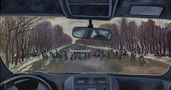 Автордың «Үйге апарар жол» атты ерекше картинасы бар. Онда суретші екі дәуірді бір жолда түйістіреді. Көнетоздау көліктің ішінде біздің қоғам – қарсы алдыңызда жолдан керуен көшіп барады. Параллель өмір. Осы шығарма туралы суретші Жеңіс Кәкенұлы мынадай ой айтады: «Мынау Люй-Коның картинасы еместей. Интерьері қаракөк, жайсыз да маркасы белгісіз автокөліктің ішінде, анау айнадан төбем ғана көрініп отырған – мен, мына өзім секілденгем. Жан-жағын қара ағаштар көмкерген, бір қар жауып үлгерген қараша, қатқақ қара жол да етене тұғын. Кенеттен, ойда жоқта, Бермуд үштағанында мачтасы аспан тіреп, бәлен ғасыр бұрын жоғалып кетіп, ғайыптан көрінген жұмбақ кемедей, жол үстін кесе-көлденең өтіп бара жатқан, әйелдер алдына бесік өңгеріп, жігіттер томағалы бүркіт ұстап, тізгін қағып, аттарына алшия қонған жақсы мен жайсаң, соңына тазы ерткен, өгіздеріне үстіне киіз үй тіккен доңғалақты арба жегіп, баяу басып өтіп бара жатқан кісілер де менің кешегі өтіп кеткен ата-бабама, ұлы көшке ұқсаған. Құлағыма олардың самбырлап сөйлеп, саңқылдап күлгені келгендей ме? Автокөліктің алдын орап (мен жаққа көздерінің қиығын да салмастан), кетіп бара жатқан, өз бояуы, өз үні өзіне жарасқан салқар көштің таяқ тастам жерден өтіп бара жатқанына, оның тікелей мұрагері мен екеніме қарамастан, әлгі көш менен, кенет, тым алыс, тым жырақ көрінген. Мен қадіріне жетпеген биік рух, кемел тіл, нағыз әуен осы көшпен ауа кеткендей ме?».