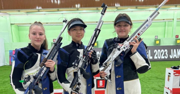 Еліміздің әйелдер құрамасы 10 метрден пневматикалық винтовкамен нысана көздеуде үздік нәтиже көрсетіп, алтыннан алқа тақты. Бұл сында ел намысын қорғаған Александра Ле, Елизавета Безрукова, Анастасия Григорьева үштігі финалда Сингапур мергендерімен сайысып, 17:15 есебімен басым түсті.