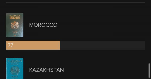 Қазақстан Мароккомен бірге 56-шы орында тұр. Екеуі де 77 ұпай алған. Қазақстанға 37 елдің азаматтары визасыз кіре алады. Ал 51 елдің азаматтарына виза алуға рұқсат берілген.