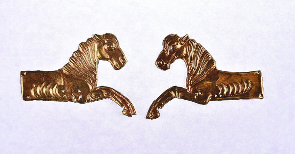 Жылқы жартылай бейнеленген жұп қапсырма – адам баскиімінің бөлшектері. Ұзындығы – 6,5 см, ені – 5,2 см. Тігуге арналған саңылаулар жылқының денесі мен аяғында орналасқан. Бекітпе саңылауларды бұлай орналастыру қапсырманы қадағаннан кейін жылқылар бейнесі көлемдірек көріну үшін жасалса керек. Мұнда жылқылардың басы мен жалы ерекше көрінеді. Жануарлардың денелері нобай нақышында жасалған. Кекілі маңдайына түскен және жалы төгілген жылқы бейнесі Азия аймағында кездеседі. Қапсырмалар қалыптау арқылы жасалған, беткі жағындағы бөлшектері оюмен нақышталған. Тұтас алғанда, қос мүсіннің келбеті ұқсас және біртұтас симметриялы композицияны құрайды. Бұл ретте олардың әрқайсының өзіндік айырым ерекшелігі бар. Қазіргі уақытта қалпына келтірілген мүсіндердің біреуінің аяғы сынған.