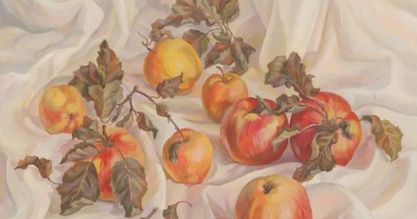 Алма – Алатаудың қазынасы. Алматының мақтанышы. Әлемдегі 2 500-ден аса алма ағашы сұраптарының атасы болып мойындалған «Malus sieversi» деген атпен белгілі жабайы алманың жұрнағы тек Қазақстанда ғана өсетінін бүгінгі ғылым растап отыр. Бұл шындық шығармашылықпен шұғылданатын шеберлерге шабыт береді. Көрме түрлі буындағы суретшінің шеберханасына шолу жасаған іспетті. Талантты қылқалам иесінің қиялынан туған шығармаларда жұпар иісіне дейін сезілген әсем гүлзар бақтар, берекелі егіс даласындағы еңбек, шырынды жеміс натюрморттары шынайы көрініс тапқан. Экспозицияда қазақ натюрмортының алғашқы авторы атанған кәсіби суретші Айша Ғалымбаеваның шығармалары, әсіресе оның алма бейнесіндегі «шырынды» композициялары түсінің еркіндігімен, қанықтығымен көз тартады. Дәл осы натюрморт көрме кеңістігінде заңды түрде басты жанрға айналған. Ғани Баяновтың «Жемістер» еңбегінде ұрпақтар сабақтастығының үздіксіз тізбегі байқалады, ал алма – ұрпақтың өркен жаюындағы маңызды бейне. Жастық шақ пен жүзінен сұлулығы төгілген жеміс жинаушылардың бейнесі Айша Ғалымбаева, Евгений Умысков, Мария Лизогубтың картиналарында бірін-бірі толықтырып, жан дүниесінің үйлесімі қуаныш толқынында тұрғанын аңғартады.