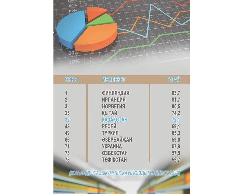 Индексте Қазақстан 72,1 ұпаймен 113 мемлекеттің ішінде 32-орын алған. Азық-түлік қауіпсіздігі бойынша көрсеткіш 2021 жылмен салыстырғанда 9,4 ұпайға көбейген. Жаһандық орташа көрсеткіш 62,2 ұпайға тең. Аймақтар бойынша Солтүстік АҚШ (78,6 ұпай) пен Еуропа (74,8 ұпай) жоғары көрсеткішке ие. Ал Суб-Сахаралық Африка (47,0 ұпай) ең төменгі орынға жайғасқан.