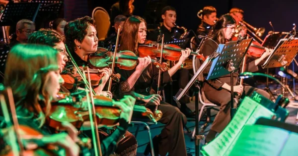Шынымен де, Дәнеш Рақышев атындағы облыстық филармонияның эстрадалық-симфониялық оркестрі құрылғалы саз қоржынын толықтырып, өнерпаздарының кәсіби шеберліктерін шыңдауда үлкен жұмыстар атқарғаны кеш барысында көзге шалынды. Арнайы келген қонақтармен бірлесе өнер көрсеткен оркестр еңбегін тамашалауға жетісулық зиялы қауым өкілдері молынан жиналғанын да айта кеткен жөн. Аймақ басшысының өзі көрермен қатарынан табылған рухани кеште «Времена года», «Концерт для флейты», «Мелодия для флейты», «Симфония 29 финал» «Happy new year», «Айттым сәлем Қаламқас», «Piece in jazz-rock», «Chi-mai», «Le lecon partticuliere», «You raise me up», «Vibaldiana», «Lay al your love on me», «Күндер-ай», «Отан таңы», «Шутка», «Вальс» сынды танымал музыка туындылары орындалды.
