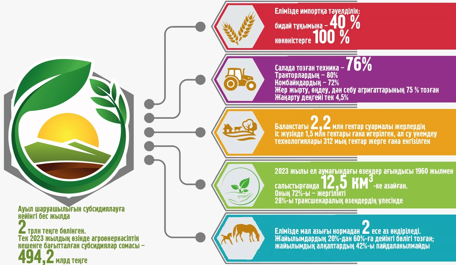 Ауыл шаруашылығы еліміз үшін стратегиялық маңызы бар салалардың бірі болғандықтан, бұл саладағы ахуал мемлекетіміздің азық-түлік қауіпсіздігіне тікелей әсер етеді. Еліміздегі ауылшаруа­шы­лық саласы әлі де болса тәуекелі жоғары, табиғи-климаттық жағдайларға тәуелді. Оның негізгі себептері – тех­ни­калық және технологиялық артта қалу­шы­лық пен өндірістегі экстен­сив­тік әдіс­тердің басымдығы. Өсімдік шаруа­­шы­лы­ғын әртараптандыру жолға қойыл­май келеді. Ауыспалы егіс қағи­да­лары дұрыс сақталмайды, топырақ құнарлығы да төмен. Минералды тыңайтқыштар өте аз көлемде енгізіледі: бүгінгі таңда тек 679 мың тонна немесе қажет­тіліктің 21%-ы (3,2 млн тонна) ғана пай­даланылған.