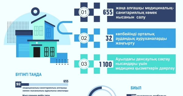 Денсаулық сақтау министрі Ақмарал Әлназарова ұлттық жоба 655 жаңа алғашқы медициналық-санитарлық көмек нысанын (медициналық пункт, фельдшерлік-акушерлік пункт, дәрігерлік амбулаториялар) салуды, 32 көпбейінді орталық аудандық ауруханаларды жаңғыртуды, сондай-ақ ауылдағы денсаулық сақтау нысандары үшін 1 100 медицина қызметкерін даярлау керектігін алға тартты. Бүгінгі таңда 92 медициналық-санитарлық алғашқы көмек объектісінің құрылысы аяқталған, 7 медициналық мекеме бойынша жұмыстар жалғасып жатыр. Бұйыртса жыл соңына дейін тағы 556 нысанды пайдалануға беру жоспарланып отыр. Ұлттық жобаның қалған бағыттары бойынша қажетті рәсімдер мен үдерістер жүріп жатыр.
