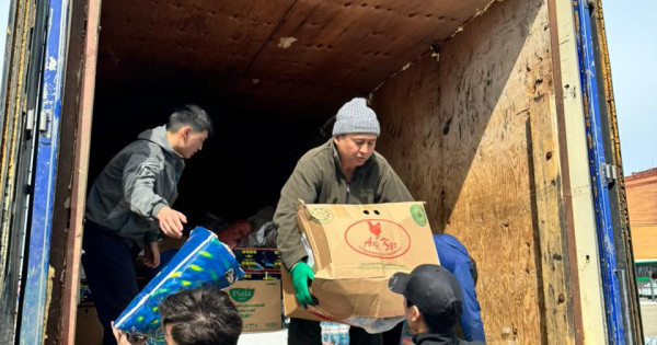 Қостанайдағы гуманитарлық көмек орталықтарының бірі «Әуежай» шағын ауданындағы Әлихан Бөкейхан атындағы мектептің спорт залына орналасқан. Аталған орталыққа арнайы барып қайттық. Біз келгенде Ахмет Байтұрсынұлы атындағы Қостанай университетінің оқытушылары мен студенттері Алматы менеджмент университеті жіберген гуманитарлық көмекті түсіріп жатты.