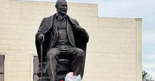 Ескертіш қоладан құйылған. Биіктігі – 3.9 метр. Туындының авторы – елімізге белгілі мүсінші Талапхан Азамат. Алаштың абыз ақсақалының айбыны асқақтап тұрған сом тұлғасы көрген халықтың көңілін толтырды.