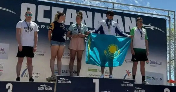 Біздің спортшымыз 10 шақырым қашықтықты жүзіп өтіп, алтын медаль жеңіп алды.