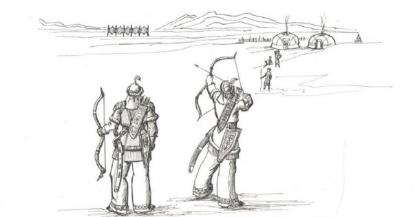 Біріншісі, керілген теріге ат үстінде шауып келе жатып 4-5 дүркін садақ тарту;
