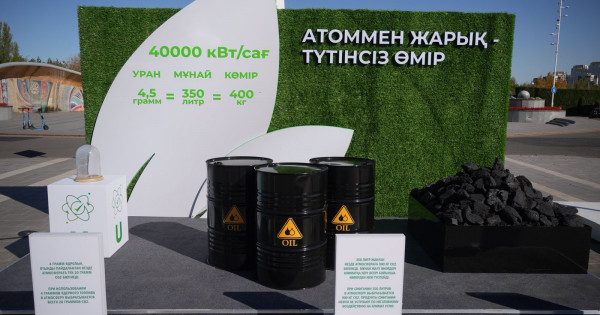Қауымдастық өкілдері салмағы 4,5 грамм бір уран таблеткасын, 350 литр мұнайы бар бөшкелерді және 400 килограмм тас көмірі салынған стендті орнатты.