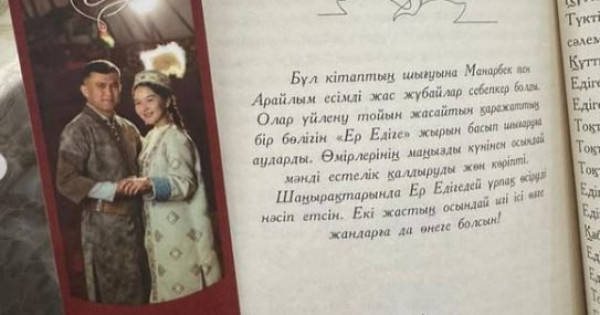 Сөйтсек, «Отбасы хрестоматиясы» сериясымен 2 мың дана болып басылған «Ер Едіге» атты кітап дәл осы жас жұбайлардың қаражатына шыққан екен. Той қарсаңында Манарбек пен Арайлым өзара ақылдасып, үйлену тойына деп жинаған қаражатының бір бөлігін осы кітапты шығаруға жұмсапты. Кітаптың арасында қос ғашықтың суреті бейнеленген тілдей қыстырма да жүр. Онда «Махаббаттың мәні» кітабынан алынған «Некенің мәні – тіршіліктен хикмет табуда бір-біріңе айнымас серік болу» деген бір ауыз цитата жазылған.
