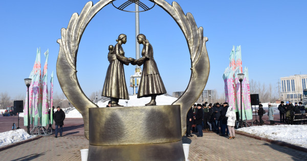 Биіктігі – 4,7 метр, ені 4,5 метр болатын сәулет өнері ақ құстың айшықты қанаттарымен көмкерілген дөңгелекпен өрнектелген. Төбесін киіз үйдің шаңырағы жапқан. Жер шары бейнесіндегі дөңгелектің ортасында қазақ әйелі баласын арқасына таңып алған кәріс әйеліне қымыз құйылған тостаған ұсынып тұр. Екі әйел де – ұлттық киімде. Мүсіндік композицияның түсі – күріш дәні тәріздес ақшыл-сұрғылт.