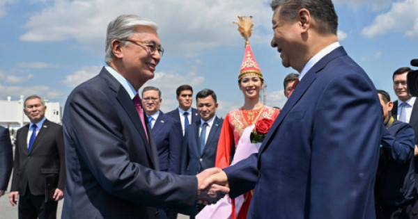 Трапта Құрмет қарауылының ротасы сап түзеді. Мәртебелі мейманға Қазақстан мен Қытай туларын ұстаған жеткіншектер қошемет көрсетті.