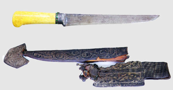 Қанжардың сабы мүйіз, жетесін қорғасын құйып шегендеген. Тегі бұл бертінде жасалған реставраторлар жұмысы болса керек. Қанжардың қыр арқасынан бастап, жетесінен созылған қос ойма қобы сызығы бар. Ұш жағы кәдімгі пышақ сияқты қайқы. Қанжар-экспонаттың құжатында: жалпы ұзындығы – 34,4 см, сабы – 11 см, салмағы 0,8 кило делініпті және бұл бұйымды музей қорына өткізген адам ретінде танымал суретші Сахи Романов есімі тіркелген.