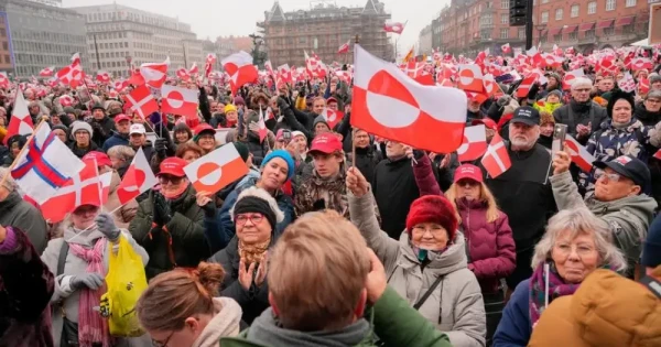 Копенгагендегі шеруде наразылық білдірушілер Дания мен Гренландияның жалауларын желбіретіп, әкімдік ғимараты алдында қызыл-ақ түстен құралған «теңіз» қалыптастырды. Олар инуит тіліндегі арал атауын айтып, «Калааллит Нунаат!» деп ұрандатқан.