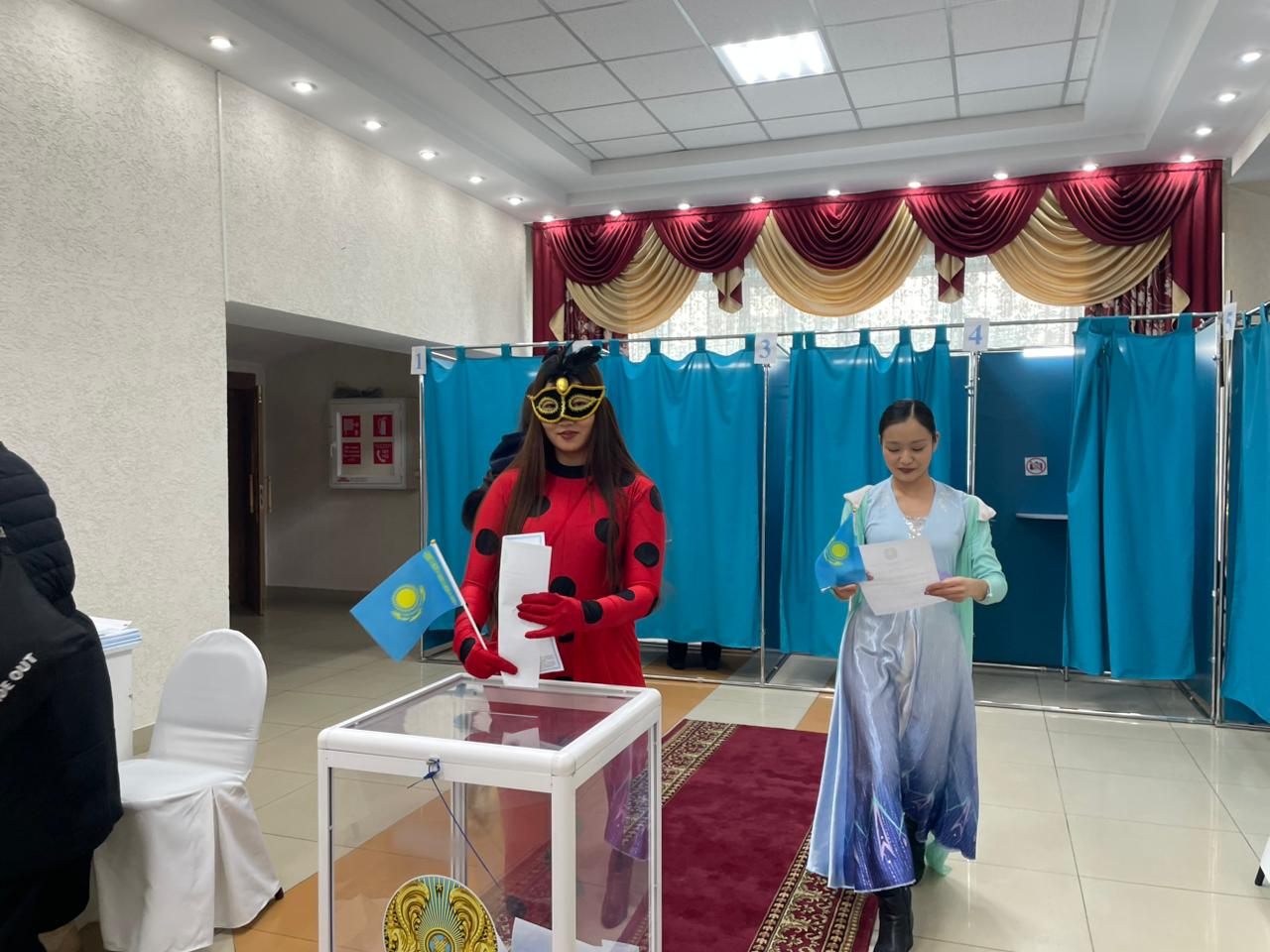 Облыс орталығындағы «Достар» мәдениет үйінде өзгеше көрініс ел назарын аударды. Ертегі кейіпкерлерінің киімін киген кәсіби аниматорлар дауыс беруге келіпті, деп хабарлайды Egemen.kz.